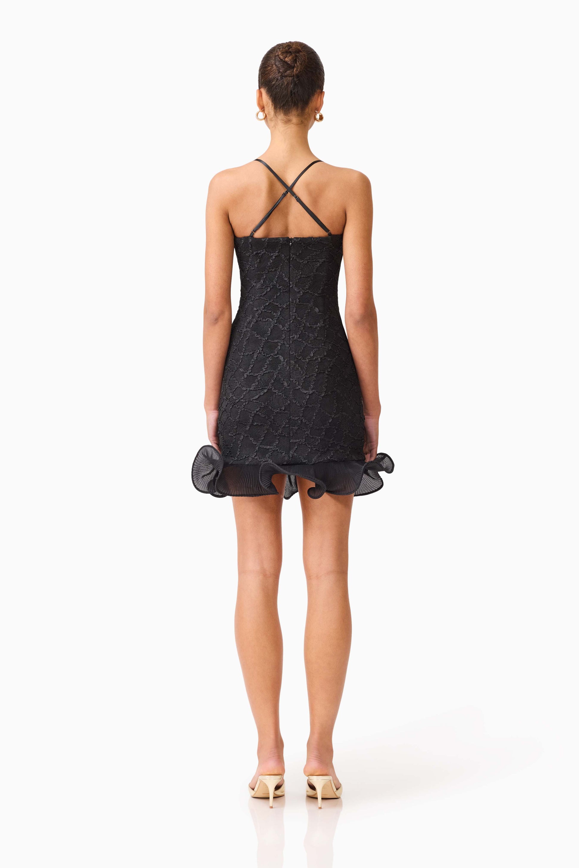 Every element of this black mini dress makes a statement. We absolutely love the hem detail and textured mesh combination.