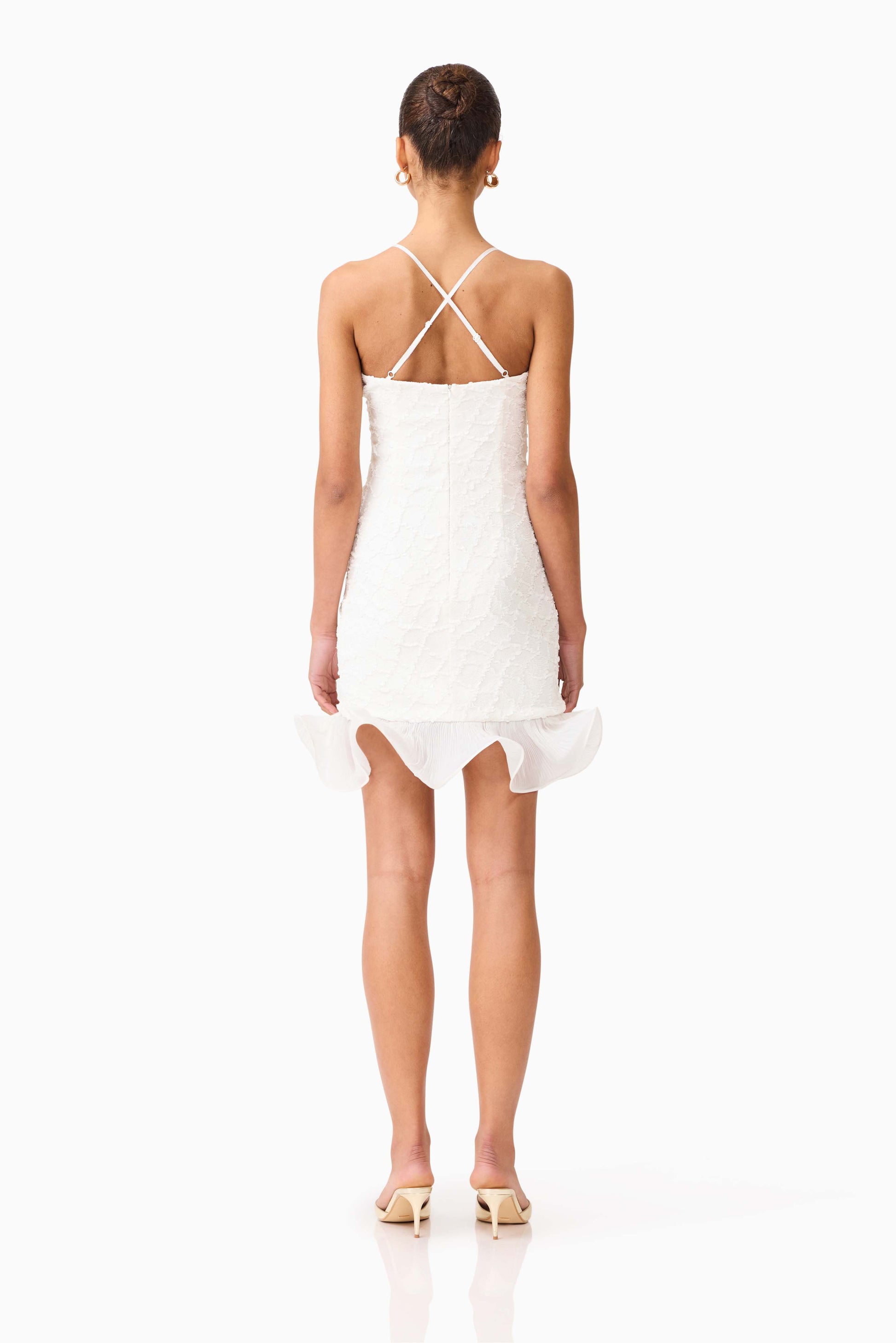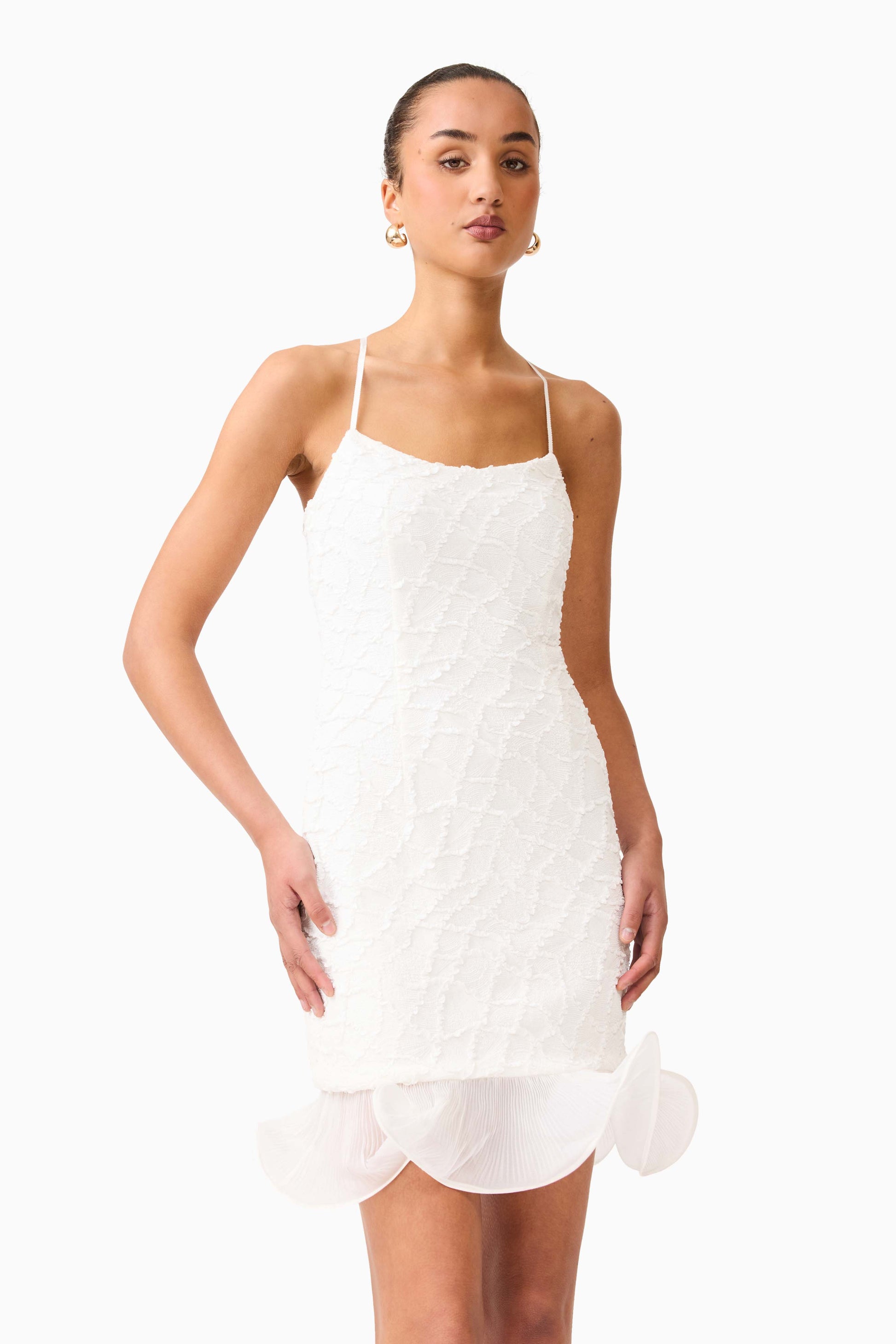 Every element of this bridal mini dress makes a statement. We absolutely love the hem detail and textured mesh combination.